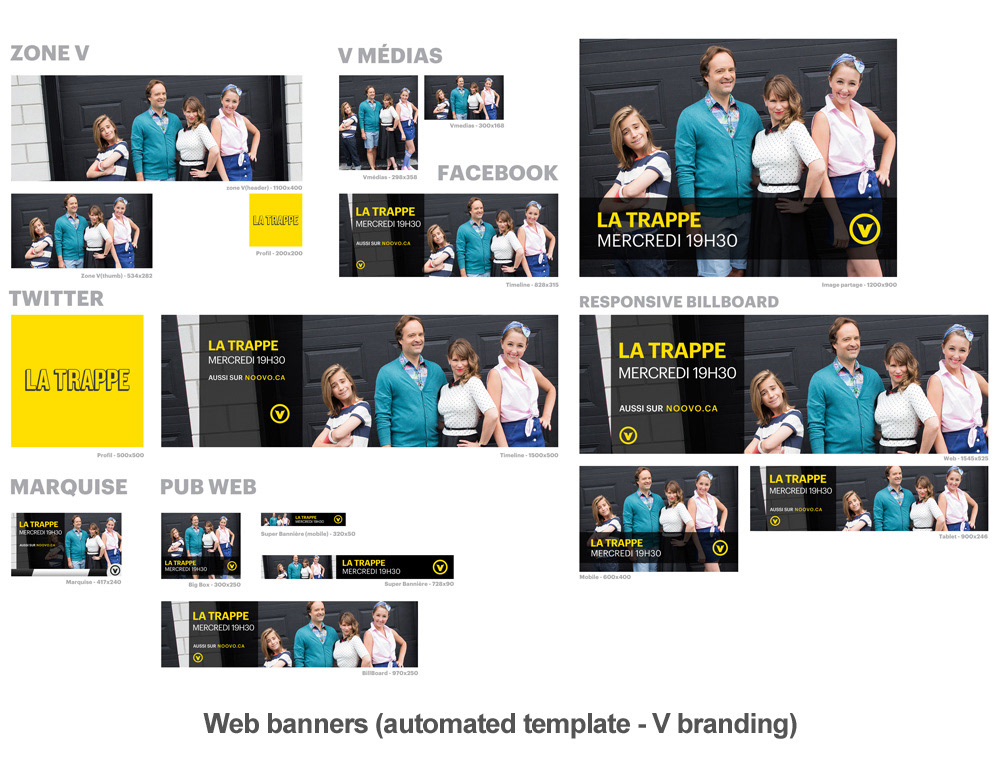 While working at Groupe V Média (from August to October of 2016), I designed and assembled various web and print graphics (banners, newspaper ads, social media, etc.) using existing brand guidelines and templates.